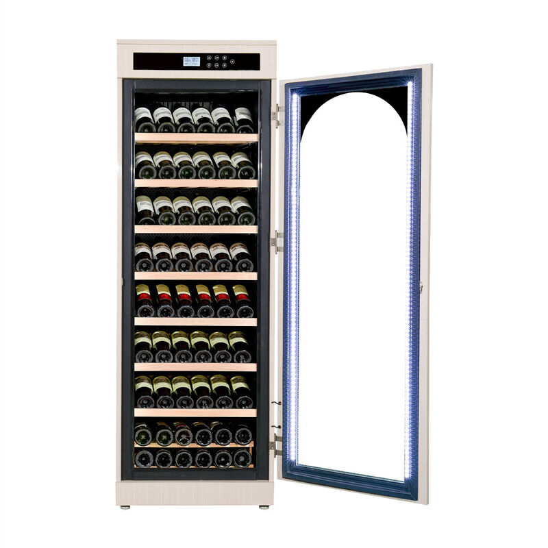 Vertical Freestanding Sleek Light Cream Wood Wine Cooler With Intuitive Digital Display