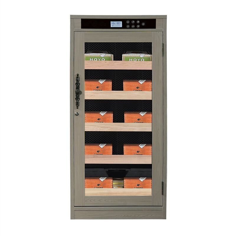 Dzięki wyrafinowanemu szaremu wykończeniu drewna, które emanuje luksusem i wyrafinowaniem, ten Chłodziarka do cygar łączy nowoczesną estetykę z ponadczasowym urokiem. Elegancki design obejmuje przezroczyste szklane drzwi, które elegancko eksponują Twoją kolekcję cygar premium, jednocześnie utrzymując optymalne warunki przechowywania. Elegancki cyfrowy panel sterowania na górze zapewnia monitorowanie poziomu wilgotności i temperatury w czasie rzeczywistym, zapewniając precyzyjną kontrolę środowiska dla Twoich cygar.